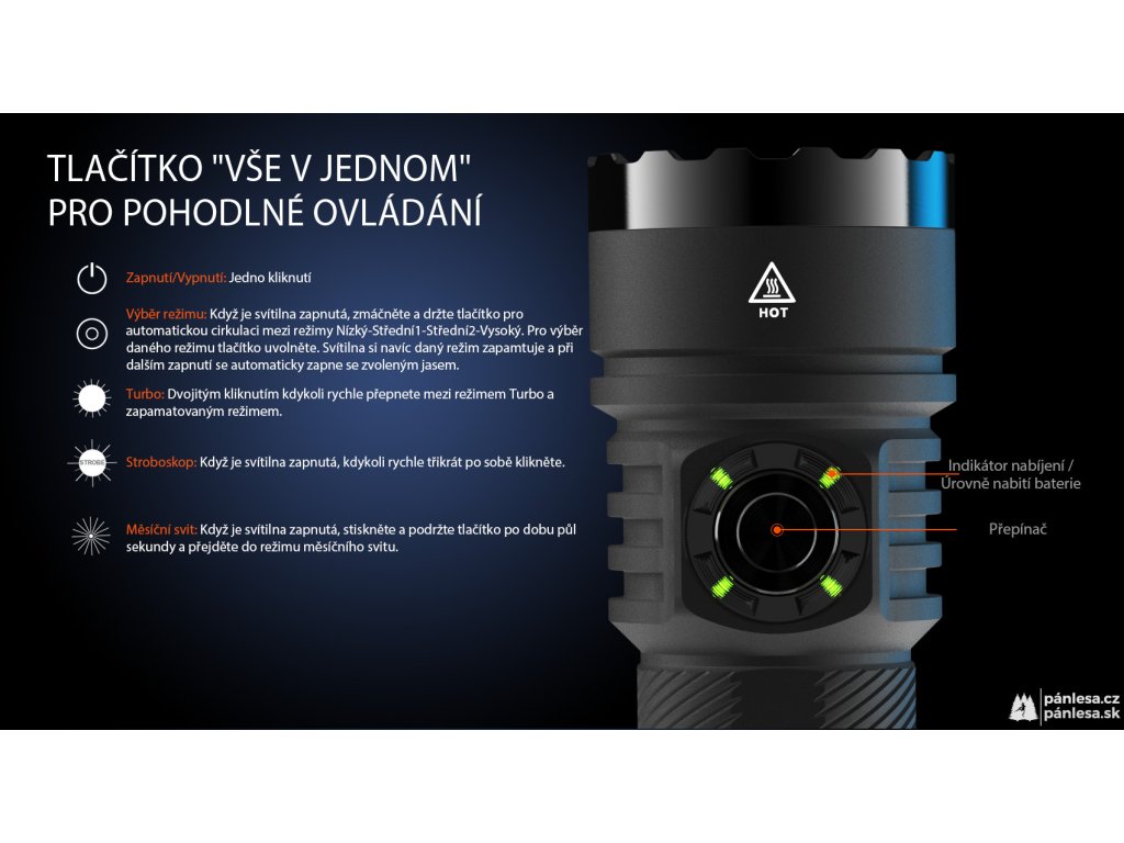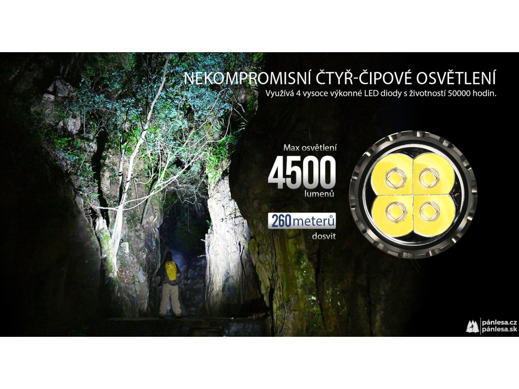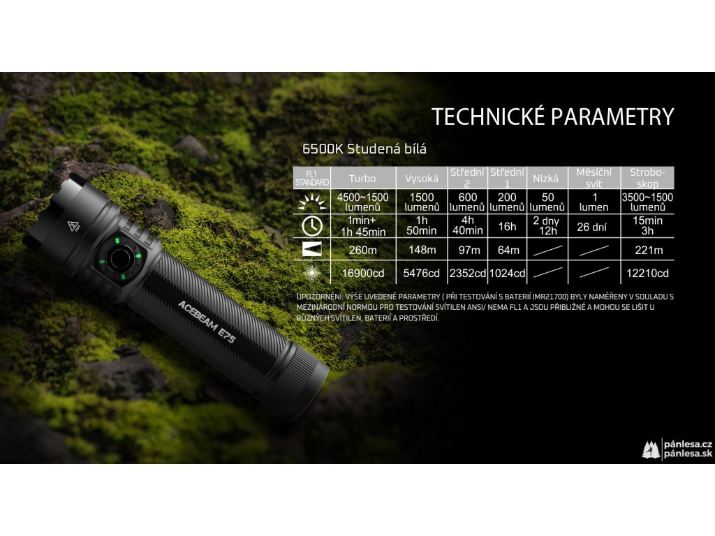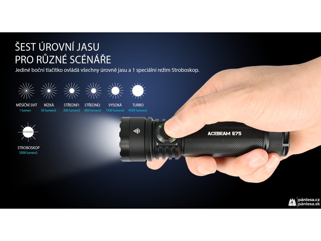 Svítilny AceBeam E75 vynikají svou robustností, taktickými vlastnostmi a skvělým zpracováním. Verze se čtyřmi LED čipy 6500K Cool White LED dosahuje hodnoty světelného toku 4500 lumenů a dosvit je skvělých 260 metrů. Intenzitu lze přepínat mezi sedmi režimy - měsíční svit, nízká, střední1, střední2, vysoká a turbo, při které dosahuje hodnoty 4500 lumenů. A jako poslední je zde stroboskopický režim. Svítilna si navíc po vypnutí pamatuje naposledy zvolenou intenzitu a při opětovném zapnutí se zapne v tomto režimu.