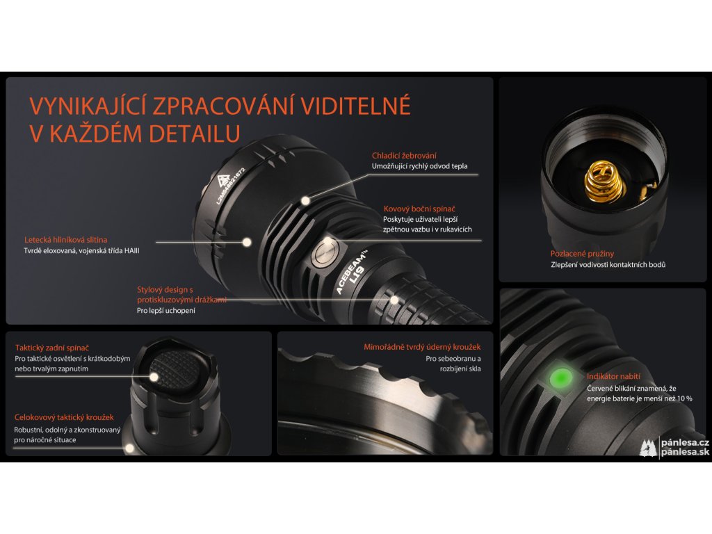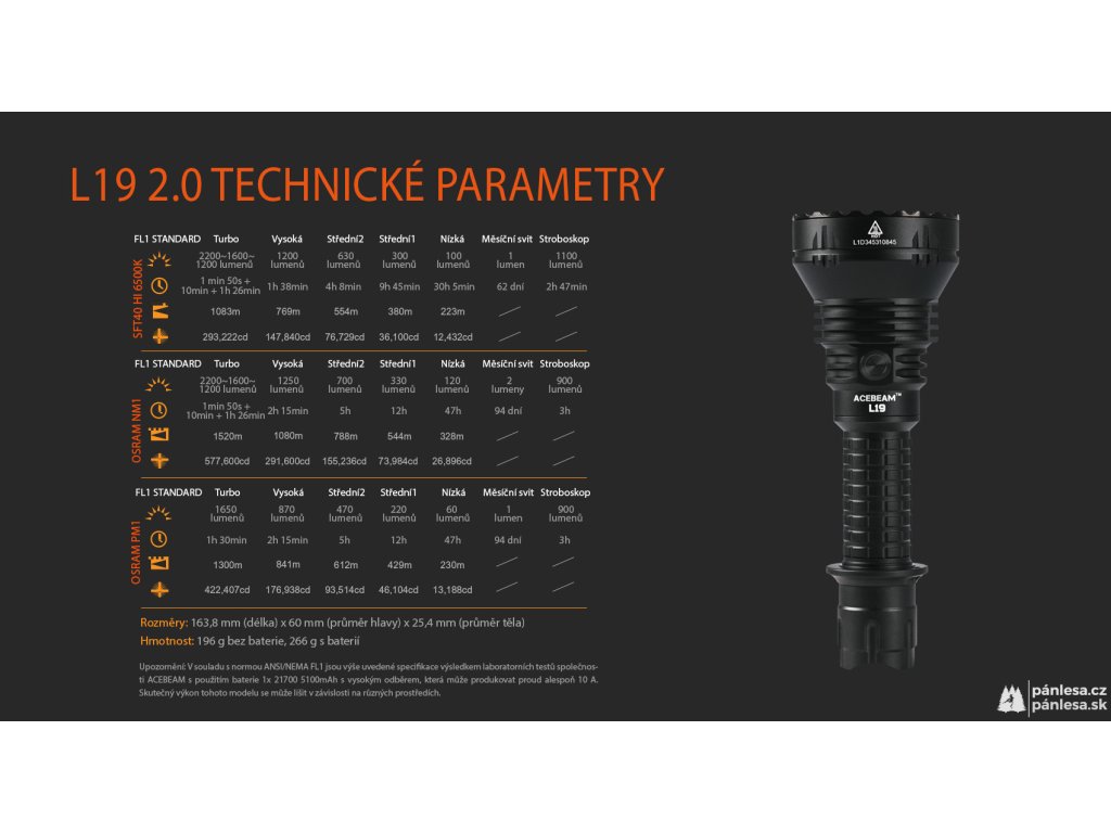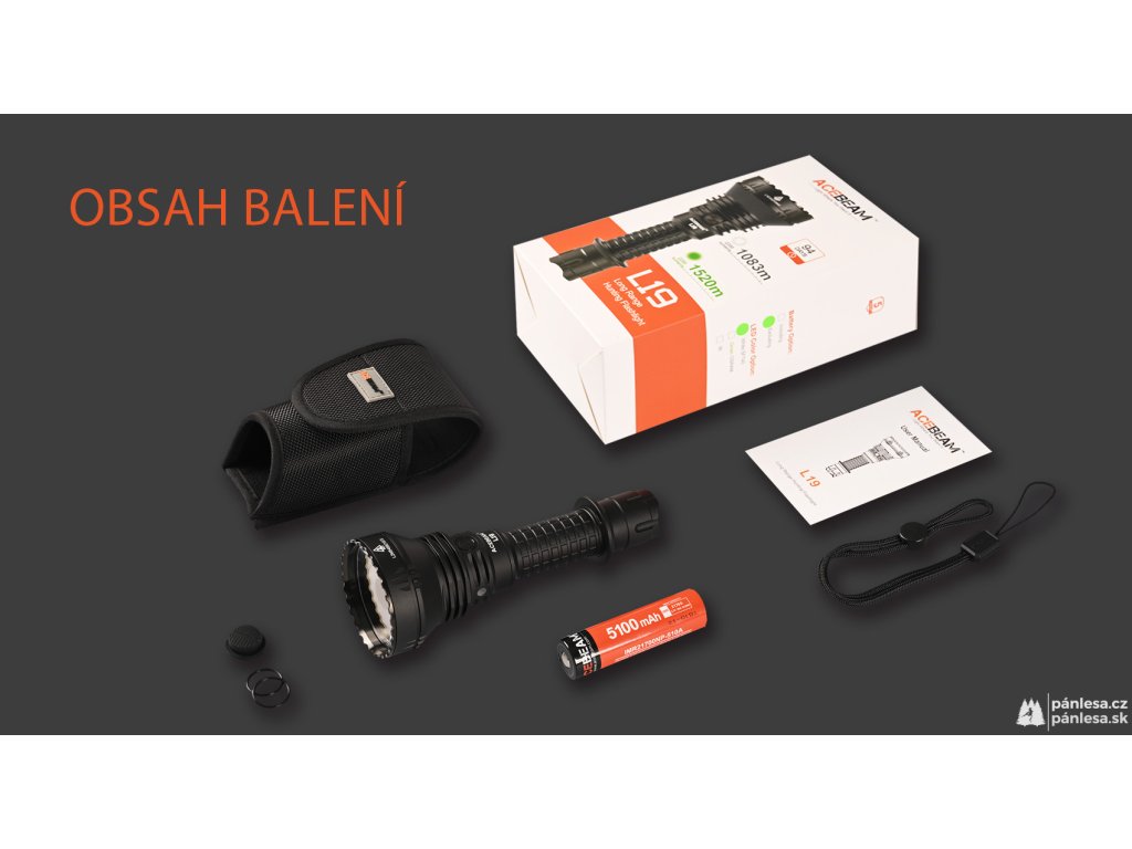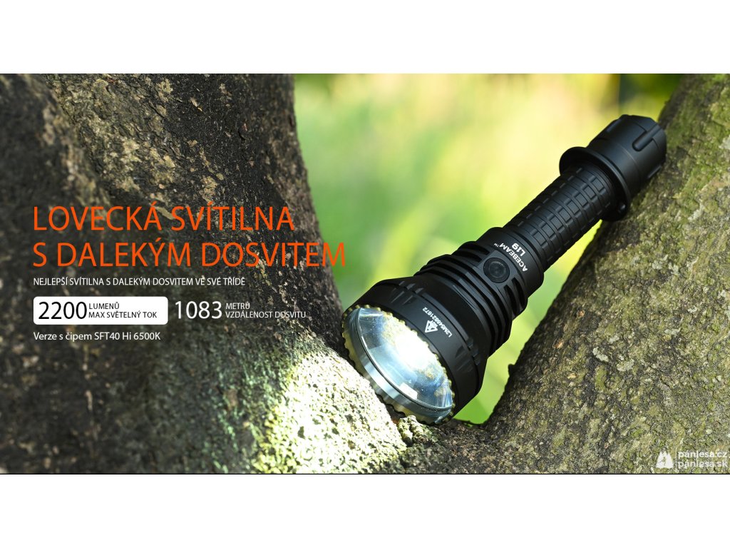Svítilny AceBeam řady L jsou určeny pro taktické a lovecké využití. Model L19 2.0 je vylepšenou verzí velmi oblíbené svítilny, která nabízí na svou třídu vynikající funkce a nebývalou dokonalost v každém detailu. Verze s LED čipem SFT40 Hi 6500k dosahuje hodnoty světelného toku 2200 lumenů a dosvit je neuvěřitelných 1083 metrů. Intenzitu lze přepínat mezi sedmi režimy - měsíční svit, nízká, střední1, střední2, vysoká a turbo, při které dosahuje hodnoty 2200 lumenů. A jako poslední je zde stroboskopický režim. Svítilna si navíc po vypnutí pamatuje naposledy zvolenou intenzitu a při opětovném zapnutí se zapne v tomto režimu.