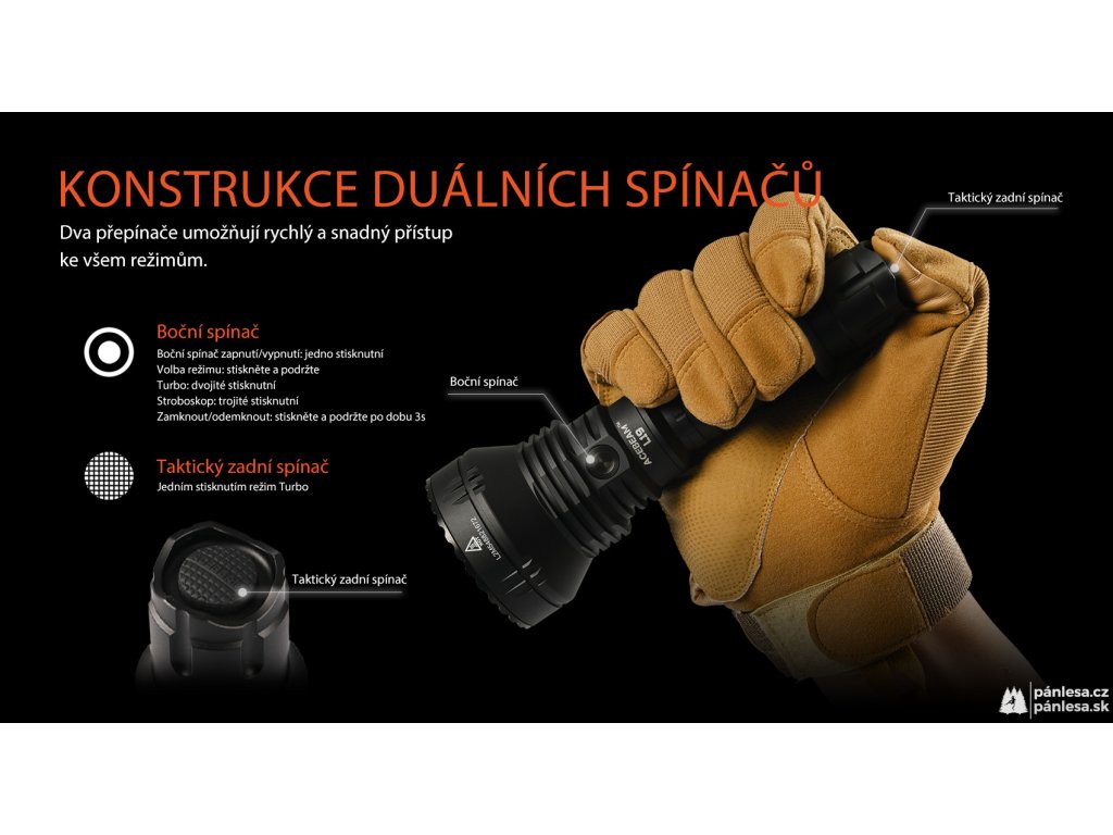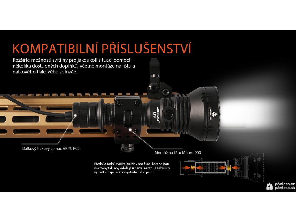Dále jistě oceníte úderný kroužek z nerezové oceli, pro který není žádné sklo dostatečně silné. Výhodou je i kompatibilita s řadou příslušenství, které umožňují svítilnu přichytit na na dlouhou zbraň a dálkovým spínačem jedním kliknutím přejít do režimu turbo.