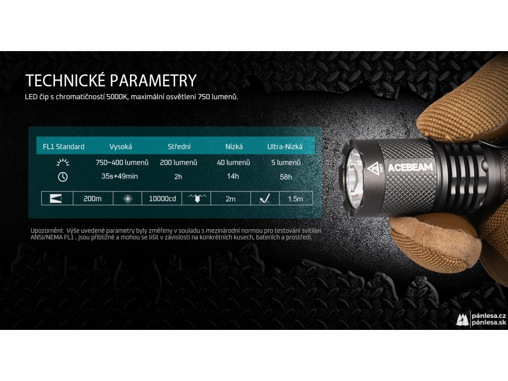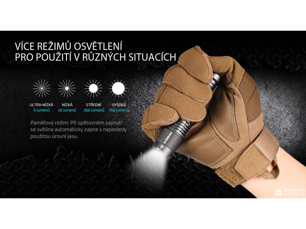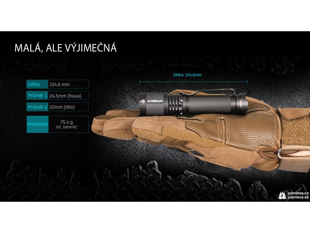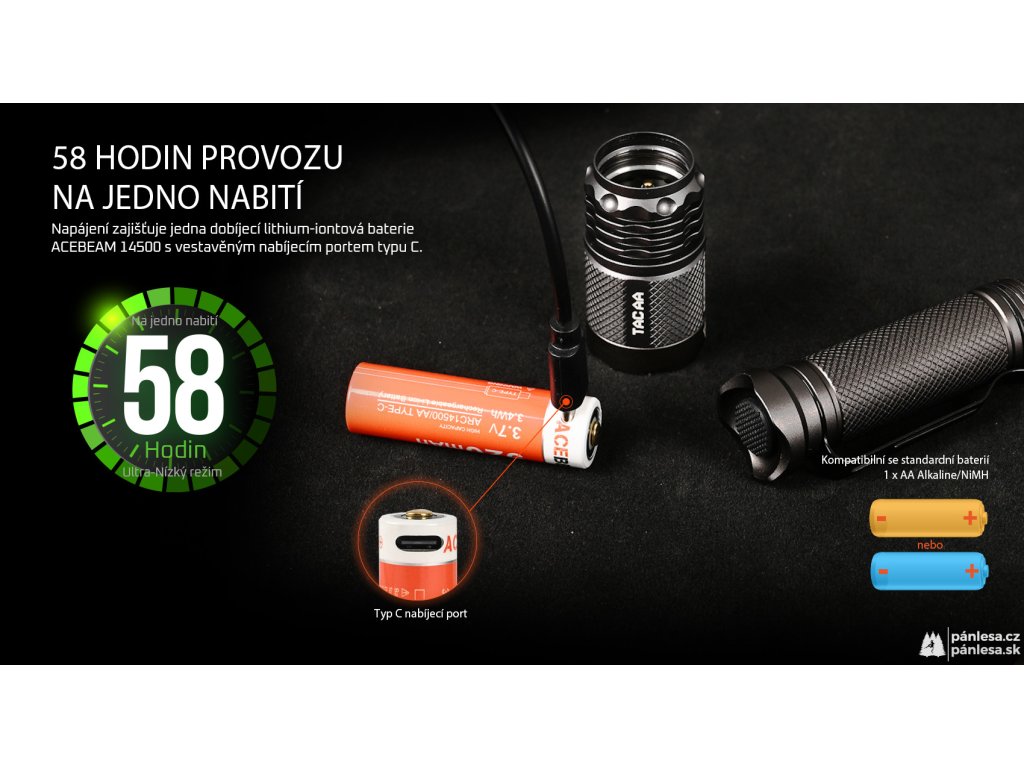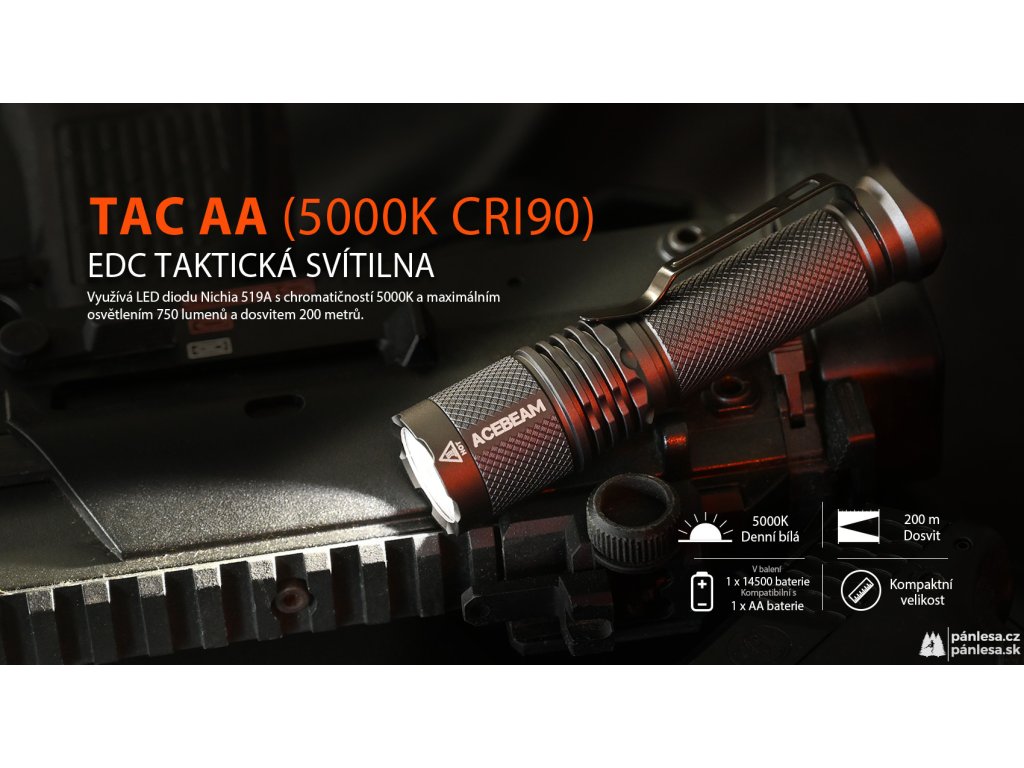 Svítilny AceBeam řady TAC AA vynikají svou kompaktností, nízkou hmotností a skvělým zpracováním. Verze s LED čipem Nichia 519A dosahuje hodnoty CRI >90, díky čemuž osvětlená plocha bude mít zcela věrné podaní barev. Intenzitu lze přepínat mezi čtyřmi režimy - Ultra-nízká, nízká, střední a vysoká, při které dosahuje světelný tok hodnoty 750 lumenů. Svítilna si navíc po vypnutí pamatuje naposledy zvolenou intenzitu a při opětovném zapnutí se zapne v tomto režimu.