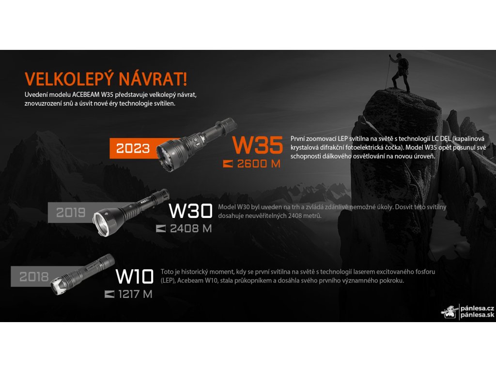 AceBeam W35 je doslova přelomová svítilna, která nabízí unikátní technologii LC DEL, což je speciálně navržený optický systém s pokročilými polovodičovými prvky pro laserové svítilny, který dokáže lépe distribuovat světlo ze světelného zdroje, snižuje výšku reflektoru na minimum a zároveň zvyšuje výkon i kvalitu paprsku. Výsledkem je tak velmi kompaktní svítilna s extrémním dosvitem 2600 metrů a devítikrokovým elektronickým ostřením.